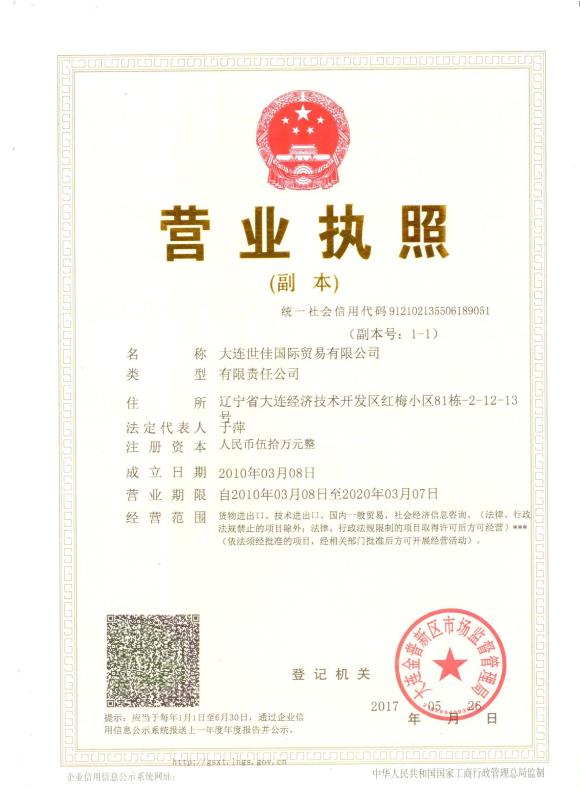 大連世佳國際貿(mào)易有限公司,是一家大型綜合性國際貿(mào)易公司,世佳貿(mào)易擁有國際最先進的生產(chǎn)和檢測設備,不斷開發(fā)新產(chǎn)品,以迎合市場需求, 公司秉承“質(zhì)量是企業(yè)的生命, 您的滿意是我們的追求”的經(jīng)營理念,堅持“客戶第一”的原則為廣大客戶提供優(yōu)質(zhì)的服務。